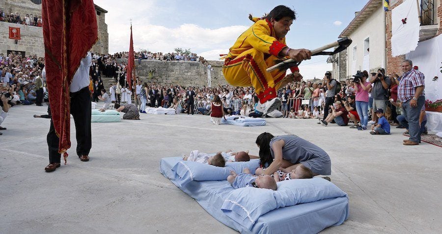 Суть ритуала в том, что мужчины, переодетые в желто-красные костюмы дьявола, с разбега прыгают через младенцев, лежащих на матрасах прямо посреди улицы. Считается, что такой «прыжок дьявола» очищает души новорожденных от первородного греха и защищает их от болезней.