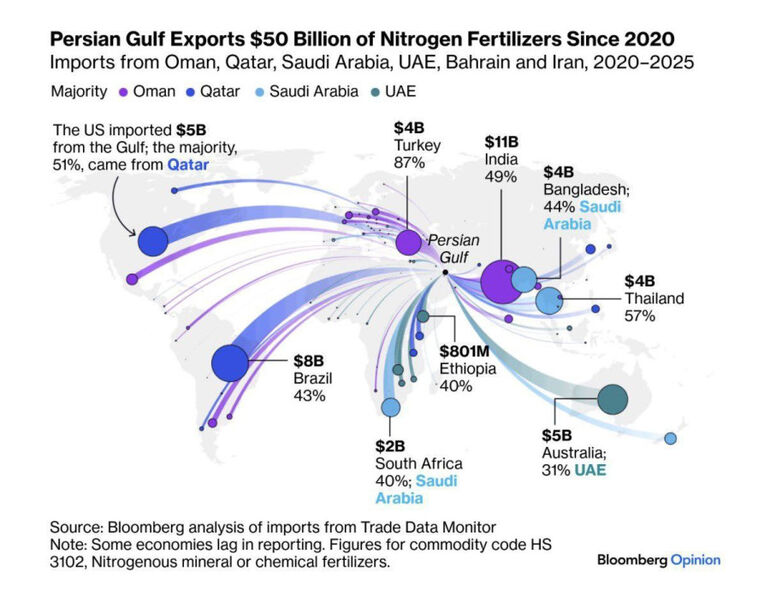 Подоспела еще одна интересная информация. Оказывается, что почти половина мирового производства ряда удобрений проходит через Ормузский пролив. Его закрытие приведет к росту цен на продукты питания и снижению уровня жизни по всему миру. А если у производителей еды не будет ударений, то можно забыть и про будущий урожай.