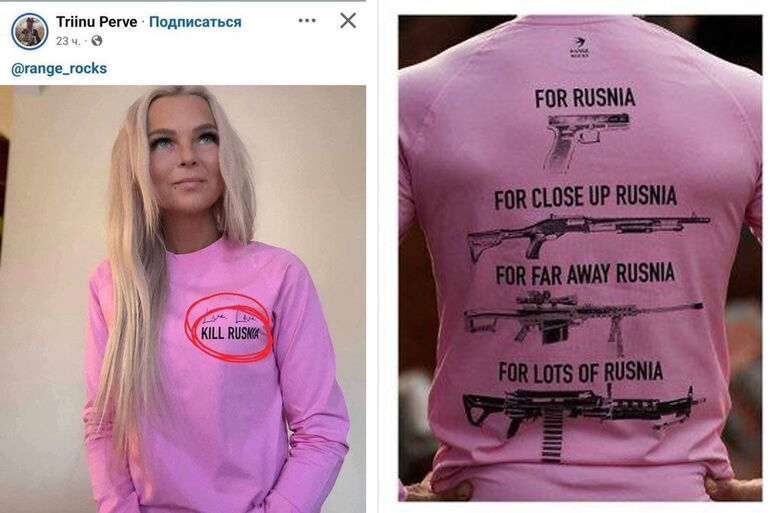 Дама в розовой кофточке с надписью “K|LL RUSN|A” — активистка и дизайнер Трийну Перве. Рекламу нового творения она опубликовала на своей странице в «Запретограмме». Фото тут же собрало кучу лайков и восторженных комментариев. Ну, потому что это не разжигание межнациональной розни и ни разу не призыв к насилию!