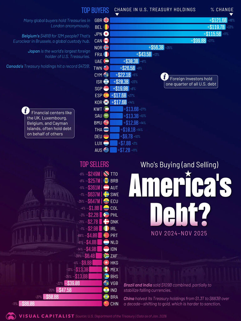 А во-вторых, что ещё более важно, мир по отношению к долларовым активом явно поляризовался. Скупают казначейские в основном союзники Америки. Продают их в основном те, с кем у Вашингтона «тёрки» уже идут, либо вскоре намечаются. И значит, мало-помалу перестаёт быть тем инструментом политического давления, каким он стал с конца 1990-х. То есть, Штаты лишились части своего влияния.