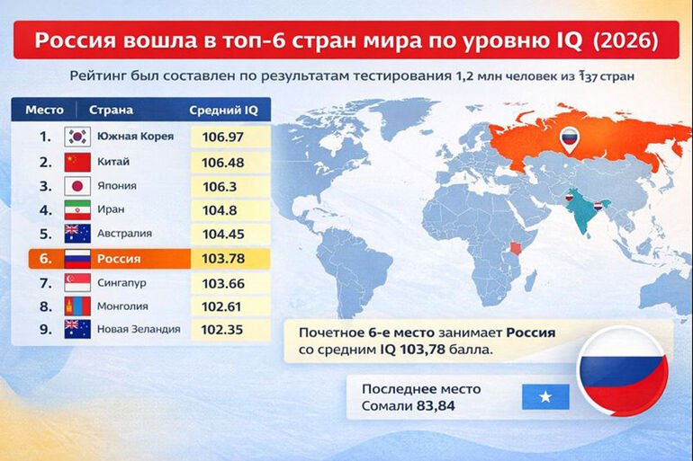 В этом году снова не попала ни в Топ-три, ни в Топ-пять главных умников и умниц планеты. По правде говоря, она и в «десятку»-то с трудом протиснулась, если учитывать не только страны, но и самоуправляемые территории. Но официально — «почётное» шестое место в глобальном рейтинге International IQ, составленном по результатам тестирования более 1,2 млн человек из 137 стран. А мировыми лидерами привычно стали три азиатских державы — Южная Корея, и Япония.