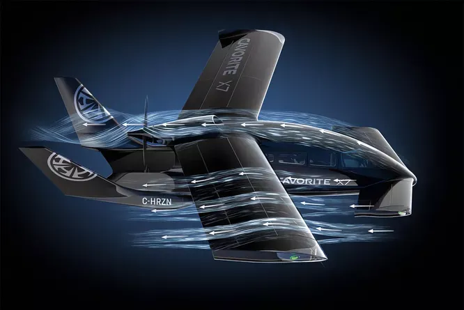 Дизайн, предложенный конструкторами из Horizon Aircraft, довольно необычен: 14 пропеллеров, обеспечивающих взлет и посадку, расположены внутри крыльев и переднего оперения. В нужный момент они скрываются под сдвижными поверхностями, позволяя Cavorite X7 двигаться как обычный самолет — с помощью большого толкающего винта в задней части фюзеляжа. Такое количество подъемных винтов явно избыточно и служит для безопасности экипажа и пассажиров. Испытания показали, что аппарат может совершать все маневры, пользуясь лишь третью этого набора.